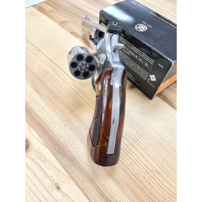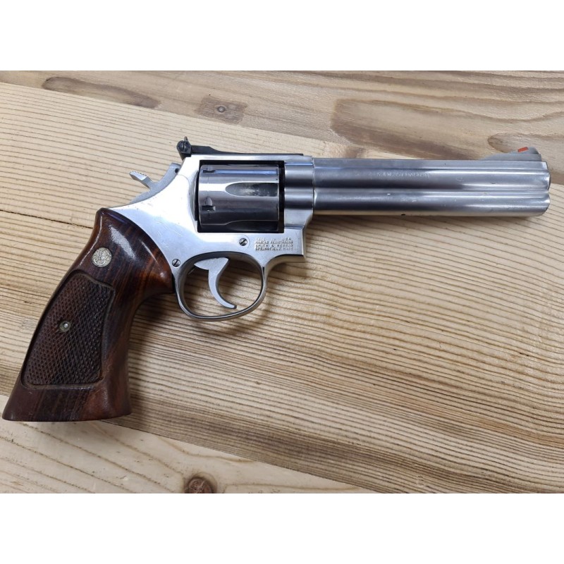 Élégant et fonctionnel, le modèle 686associe le très populaire revolver Smith & Wesson 686 à d'élégantes poignées en bois texturé au look classique.